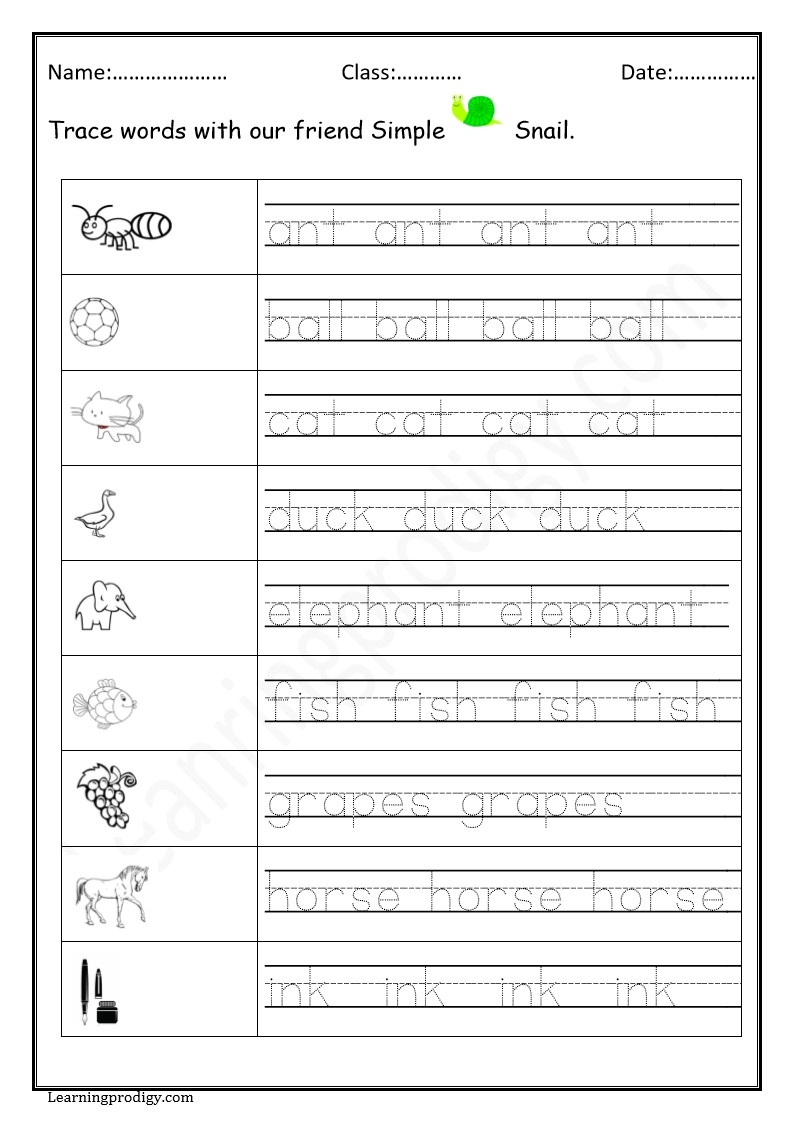 Free Printable Words Tracing Practice Worksheet With Pictures