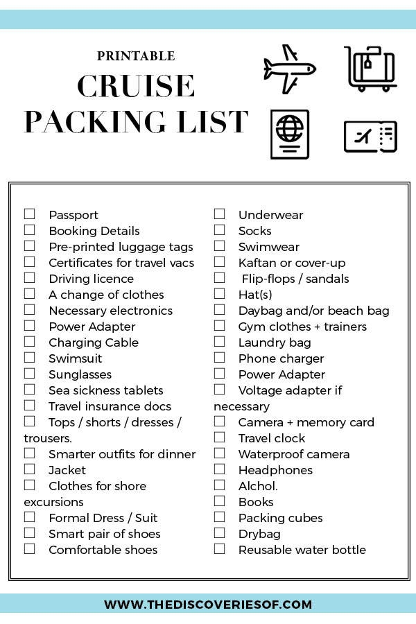 Whether you’re a first-time cruiser or a seasoned sailor, making a packing list can help you stay organized and make sure you have everything you need for a comfortable and enjoyable trip. To help you get started, here is a printable packing list for a cruise that you can use as a guide: