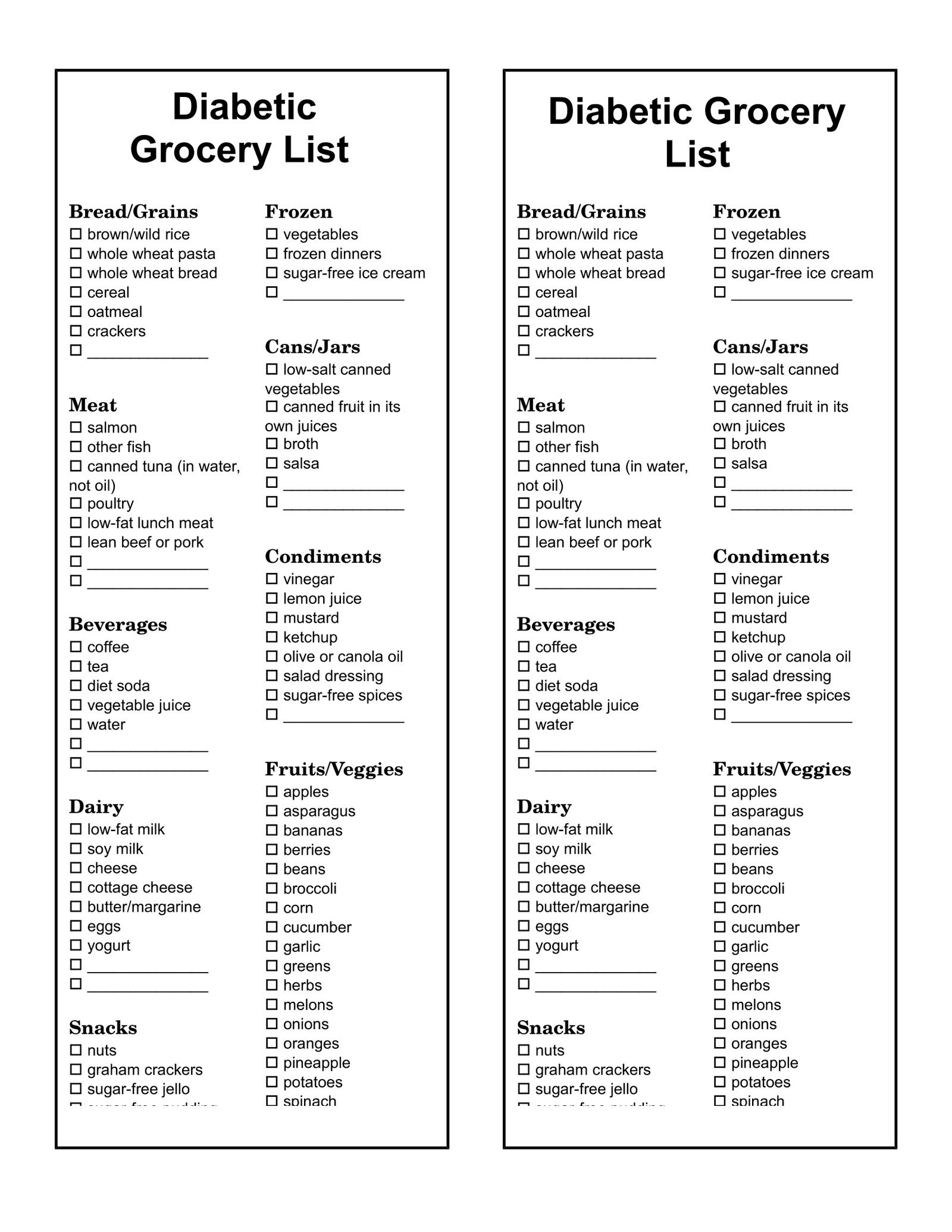 Download and Print Printable Diabetic Food Lists