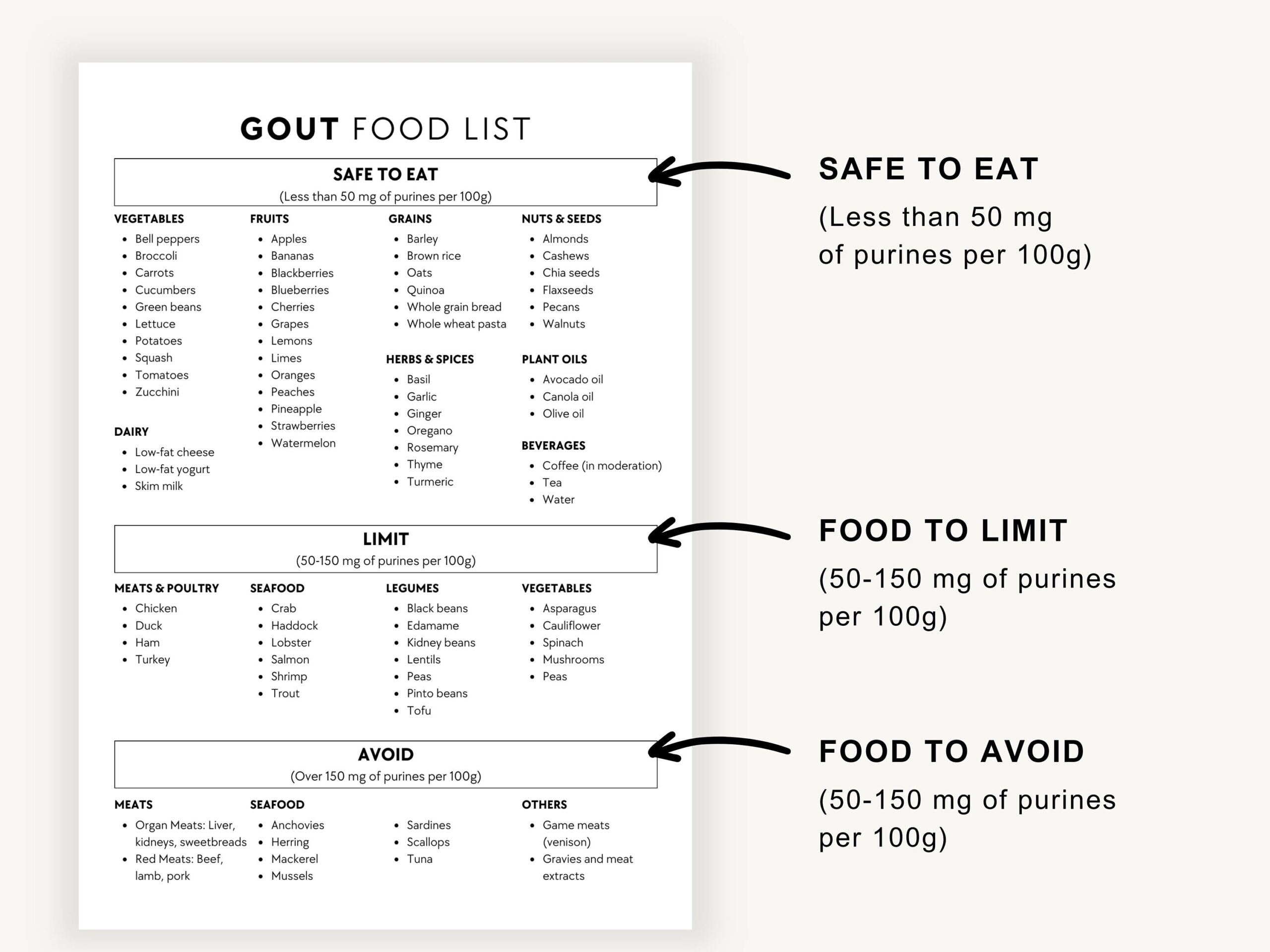 Gout Food List PDF Printable Low Purine Foods Diet Plan Grocery Guide