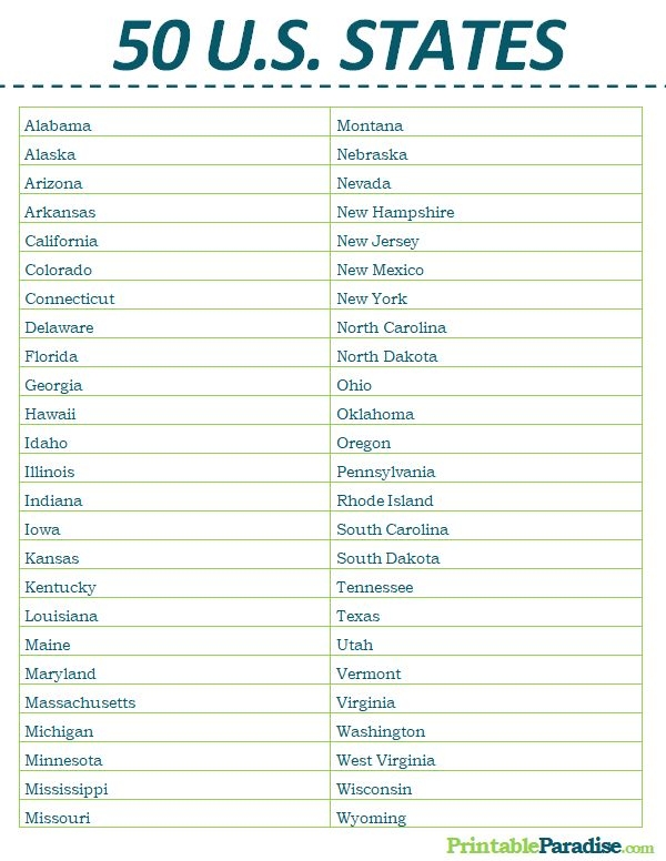 Download and Print Printable List Of States
