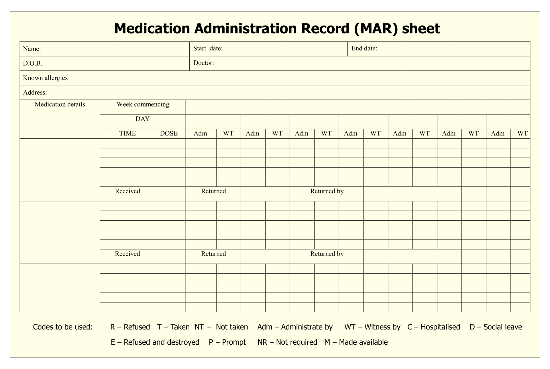 Get and Print Printable Medication Administration Record Template Word