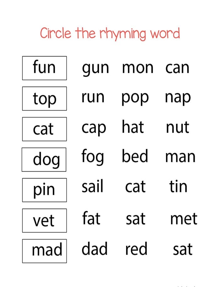 Download and Print Printable Rhyming Words For Kindergarten