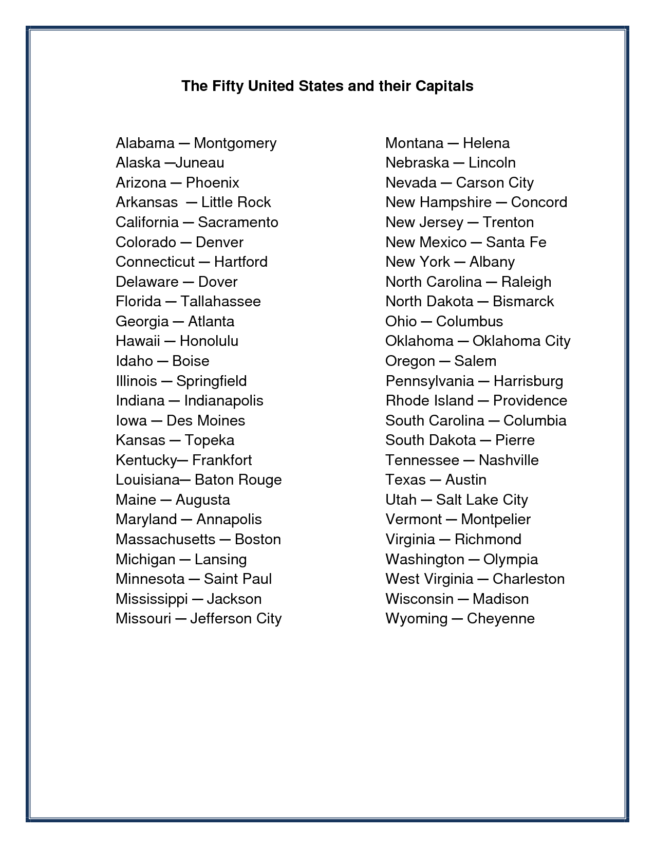 50 States And Capitals List Free Printable50 States And Capitals List Free Printable